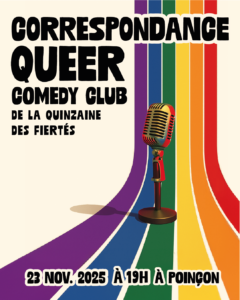 Dans le cadre du Festival des Fiertés de la mairie du 14e, Correspondance Queer revient pour une édition spéciale haute en couleurs ! Ce format stand-up unique célèbre la diversité, l’humour et la liberté d’expression, en donnant la parole à des humoristes LGBTQIA+ et allié·es prêt·es à faire vibrer la scène de Poinçon. Cette soirée met en avant la carte de découverte, une invitation à explorer de nouveaux talents, de nouvelles voix et à rire ensemble de ce qui nous…