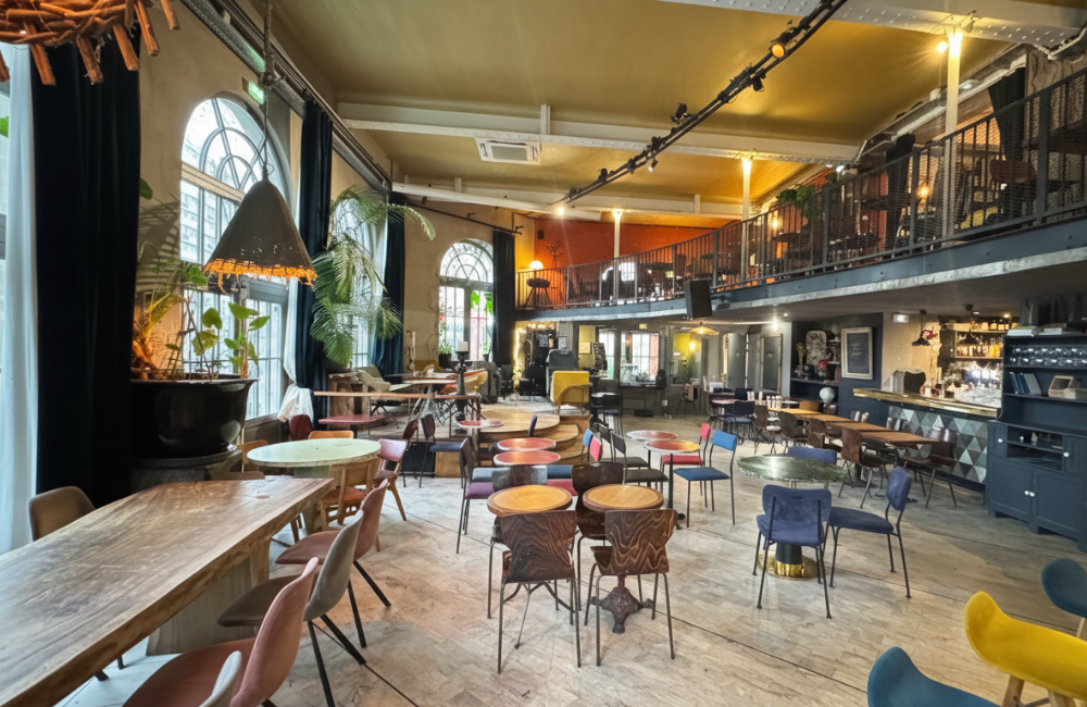Cathédrale de brique et de verre avec ses grandes baies en forme de vitraux et ses 6 mètres de hauteur, l’ancienne salle des pas perdus garde de ses origines l’idée du croisement des voyageurs de passage, actualisé par des propositions qui font la part belle aux plaisirs artistiques, ludiques et gustatifs.